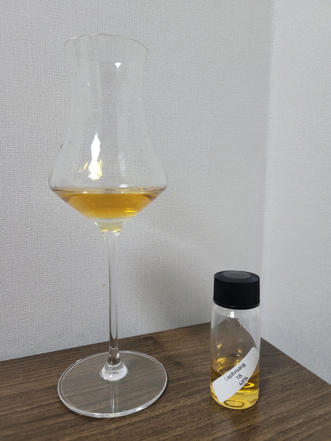 향: 알코올 튀는 것 없이 매우 잔잔하다. 꿀레몬청의 눅눅한 시트러스와 바닐라의 단내가 풍성하게 올라온다. 구형 몰트의 신문지 뉘앙스와 현행 몰트의 건초스러운 느낌이 섞여있으며, 라프로익 특유의 약품 냄새와 스모키가 은은하고 상냥하게 다가온다. 살짝 구워내 껍질을 깐 은행과 레몬그라스 그리고 알량한 백후추가 가볍게 코 끝을 스친다. 공기와의 접촉이 길어질수록 골드키위의 시트러스, 머스켓의 청량함, 씨앗 있는 부분의 참외와 멜론의 단내, 반투명 액체가 스며든 꿀사과 등 과일이 풍성하게 나타난다. 머스크와 백단향이 살짝 훑고 지나가면, 백합과 목련 따위의 꽃내음이 이어진다. 화이트 초코 뉘앙스로 끝난다. 향의 볼륨감과 복잡성이 대단하다.
