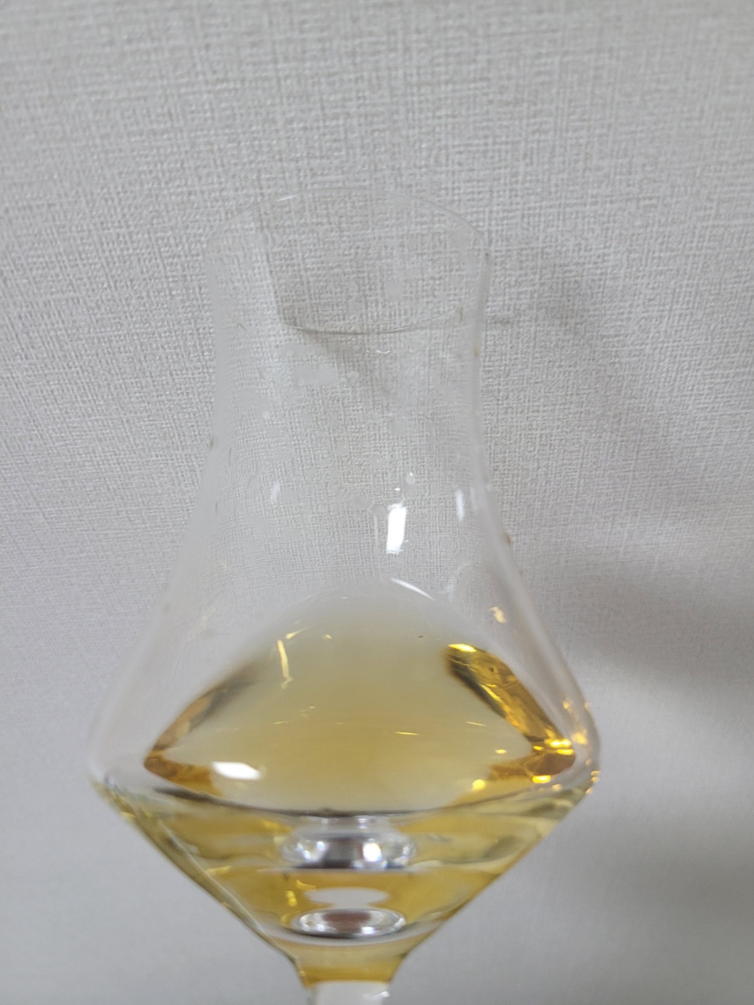 목 넘김 및 여운: 매우 부드러운 목 넘김이다. 비강에는 은은한 피트감과 레몬즙 한 방울 뿌린 바닐라 시럽 뉘앙스가 나타났다가 빠르게 사라진다. 혀에는 짠맛과 감칠맛이 느껴지며, 참외의 하얀 부분에 해당하는 밋밋한 단맛이 났다가 바로 사라진다.
