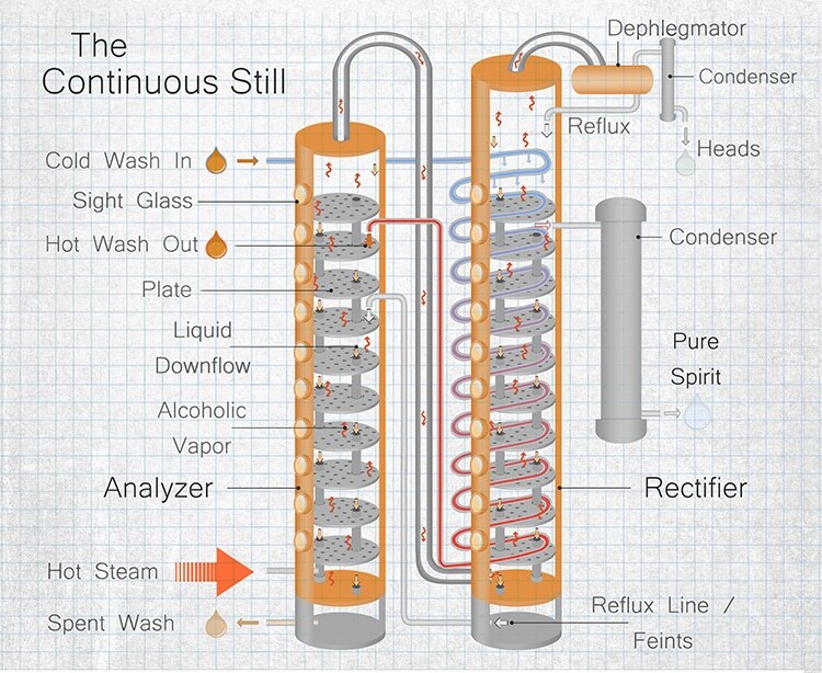 컬럼 스틸의 핵심 기능은 환류(Reflux)에 있다. 환류가 누적되어 고도로 정류된 알코올은 연속적인 컬럼 시스템을 통해서만 얻을 수 있다. 이는 부피 생산량 측면에서 대단히 효율적이기 때문에 초류(Head)와 후류(Tale)를 재처리하여 가수 컬럼(Hydro Selection) 및 탈메틸화 컬럼(De-Methylising Column)을 통해 수집된 에탄올의 양을 최대화하고, 고유의 풍미를 최소화한다.