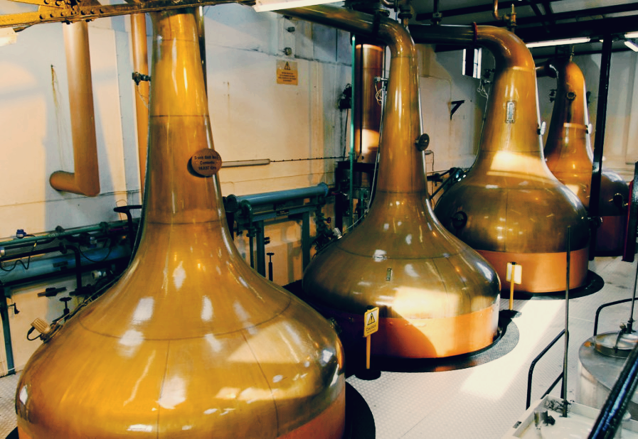 증류소 내부의 스틸룸에는 구리로 된 2쌍의 팟 스틸이 있다. 워시는 워시 스틸에서 가열되어 기화 & 응축된다. 알코올 도수 약 23%의 로우 와인(Low Wine)이 생성된다. 로우 와인은 다시 스피릿 스틸로 투입되어 기화 & 응축된다. 스피릿 세이프를 통해 미들컷을 잡으면 8 ~ 10ppm 수준 및 알코올 도수 약 69%의 뉴 메이크 스피릿이 된다. 연간 약 200만 리터의 순수 알코올을 생산한다.