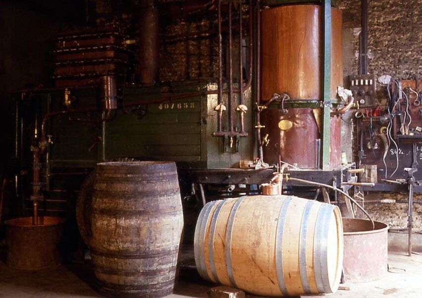 1880년 제작된 이동식 마리 잔느(Marie Jeanne) 아르마냑 스틸(Alembic Armangacais)을 직화로 섭씨 약 55도까지 가열한다. 5리터의 와인을 한 번 증류하면 풍부한 꽃향과 과일 향이 특징인 1리터의 오드비가 나온다. 약 15 ~ 20배럴 분량을 생산한다.