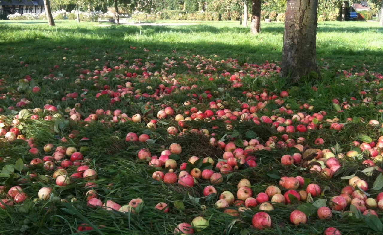 깔바도스 생산을 위한 사과는 주로 곤느비유-쉬르-옹플뢰르와 꾸드레-라뷔 사이 3 ~ 20헥타르에 해당하는 두 가족 소유의 4개 농장에서 주로 수확된다. 과수원은 소를 풀어 토양을 비옥하게 하고 벌레 먹어 떨어진 사과를 먹게한다. 농장은 원산지 보호 명칭(AOC/Appellation d’Origine Contrôlée Pays d’Auge)에 의해 승인된 약 35가지의 사과 품종을 재배한다. 크리스티앙 드루앵이 사용하는 품종은 주로 네 가지 유형 및 비율로 나뉜다.