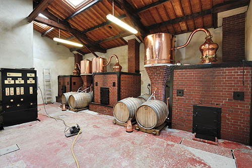 발효가 끝난 시드르는 구리로 된 1,200리터 용량의 팟 스틸 1개와 400리터 용량의 팟 스틸 2개에서 이중 증류된다. 팟 스틸은 나무를 태워 직화로 가열된다. 첫 번째 증류에서 알코올 도수 약 30%의 “Petites-Eaux”가 생성되며 두 번째 증류에서 “Très Volatiles”라 하는 알코올 도수 약 70%의 증류액이 생성된다. 두 경우 모두 휘발성이 높은 초류와 무겁고 지방이 많은 후류를 제거하여 본류만을 포집한다. 모든 과정은 "Calvados Pays d'Auge"의 사양에 맞춰 수행된다. 증류는 약 3개월간 진행되며, 컴퓨터를 일절 사용하지 않는다.