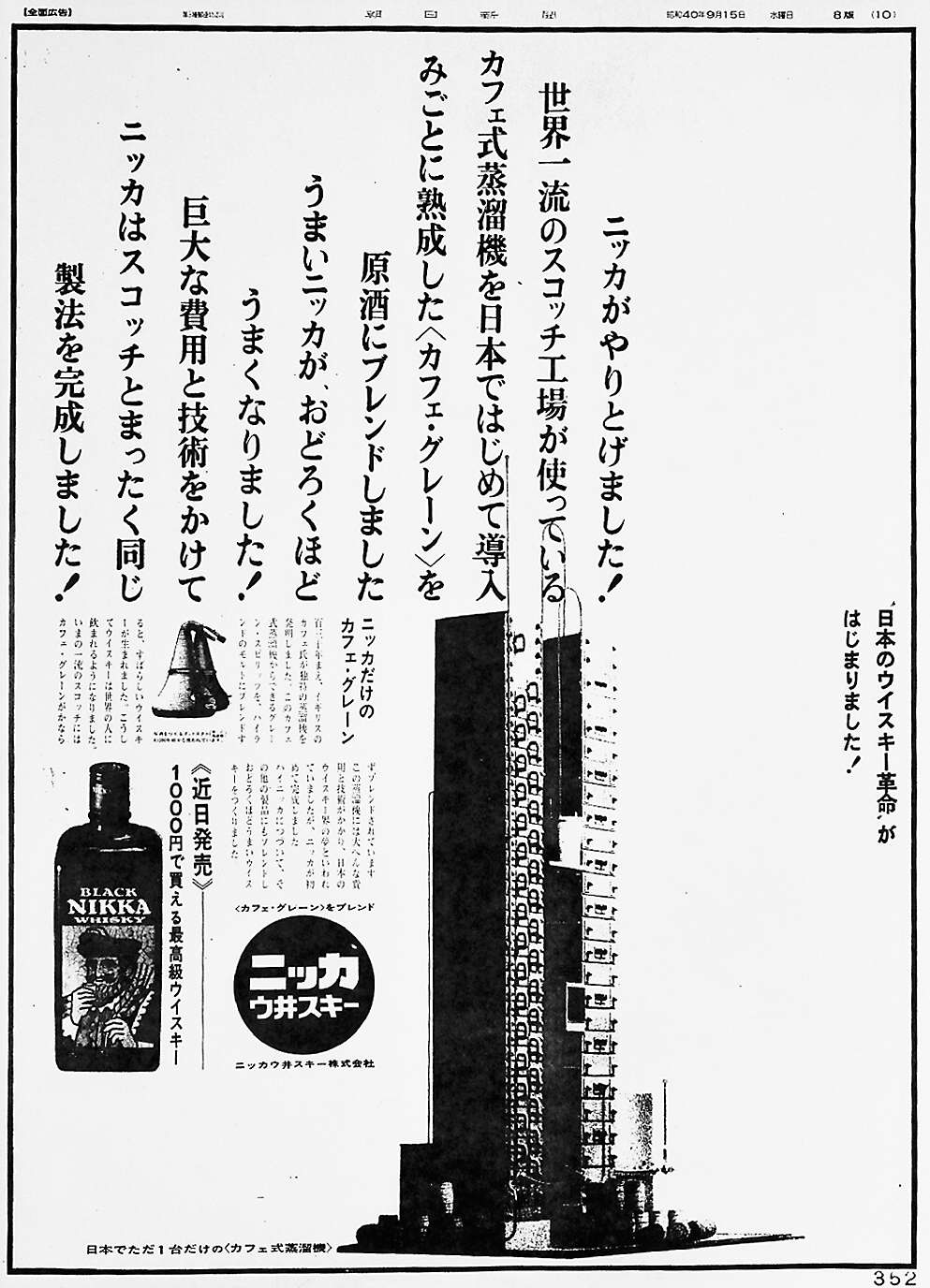 1964년, 일본에서 생산된 몰트 위스키와 그레인 위스키를 혼합한 2급 위스키인 하이닛카(ハイニッカ)를 출시했으며, 다음 해에는 1급 위스키인 블랙닛카(ブラックニッカ)를 출시했다. 당시 업계를 선두 하던 산토리도 블렌디드 제품을 출시하여 위스키 시장에 대한 경쟁이 일어났다. 그 해에 다케츠루 마사타카의 아들인 다케츠루 다케시(竹鶴威)가 요이치 증류소의 공장장으로 취임했다. 이후 닛카 위스키의 마스터 블렌더와 사장을 거쳐 퇴임하고, 그 자리를 사토 시게루(佐藤茂生)에게 물려주었다.