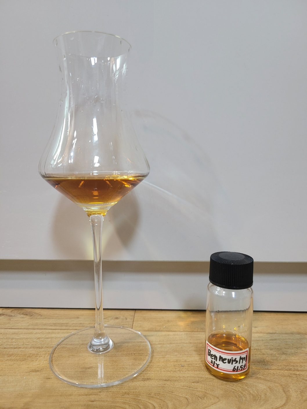 향: 향이 닫혀있어 풍부한 에스테르와 오크정도만이 느껴진다. 공기와의 접촉이 최소 30분을 지나면서 커피맛 스카치 캔디, 토피넛, 살짝 탄 캐러멜, 얼그레이 피칸 파이, 버터를 잔뜩 넣은 크루아상 따위가 은은하게 올라온다. 벤 네비스 스피릿 특유의 요거트스러운 젖산 발효취는 오랜 기간의 오크터치로 인해 약간의 꼬릿함을 가진 스모크 치즈를 연상케 한다. 오랜 숙성기간에도 불구하고 갱지 같은 몰트 뉘앙스가 어느 정도 살아있다. 세무 가죽, 썩기 시작하는 낙엽, 축축한 흙내음 등 다소 더티한 느낌이 있다.