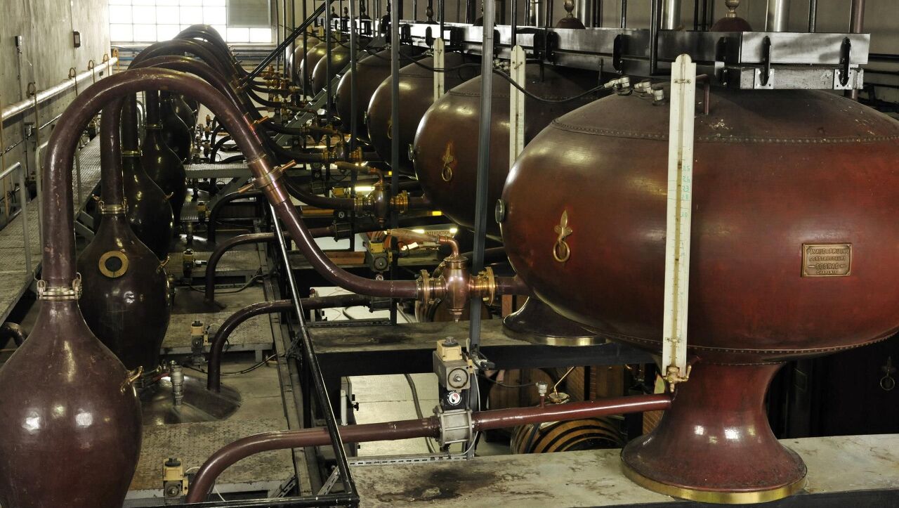 까뮈의 뷔송 증류소 안에는 약 9개의 구리로 된 사량테 팟 스틸(Alembic Charentais)이 있다. 구리는 원치 않은 황 화합물을 제거하는 기능을 한다. 첫 번째 증류(Le Brouilles)는 12,500리터 용량의 팟 스틸에서 이루어지며, 알코올 도수 약 30%의 로우 와인이 나온다. 두 번째 증류(La Bonne Chauffe)는 2,500리터 용량의 팟 스틸에서 진행되며, 한 번에 1리터씩 분리하여 약 20리터의 초류를 대조한다. 20개의 샘플 중에서 에스테르의 농도가 가장 높은 것을 찾아 증류가 끝난 즉시 본류와 혼합한다.