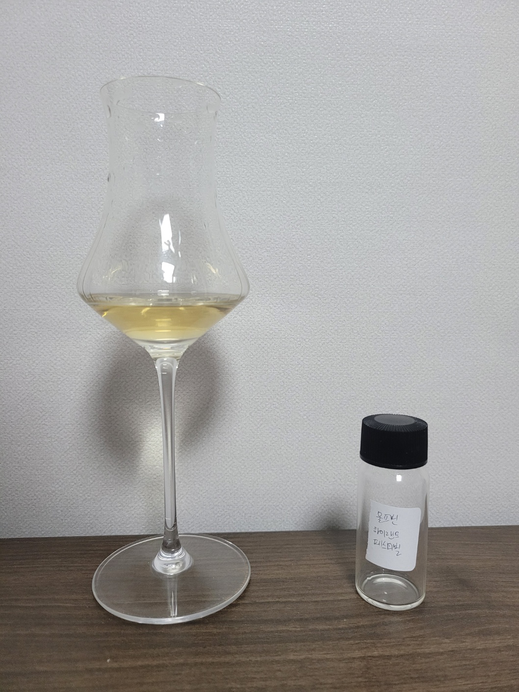 향: 스피릿취가 있지만 알코올이 매우 차분하여 튀는 느낌은 아니다. 바닐라를 비롯해 참외 과육의 단단한 부분, 상온에 오래 두어 푸릇푸릇함이 죽은 청사과, 천도복숭아, 레몬즙의 시트러스, 무에서 오는 은근한 알싸함, 레몬그라스의 싱그러움이 있다. 하얀 재와 약간의 페놀릭 한 피트감이 올라온다. 중후한 곡물 느낌이라기보다는 콩시루떡에 덕지덕지 붙어있는 콩고물 냄새와 유사하다. 끝에 짠기가 가볍게 맴돈다. 전체적으로 단순명료하다.