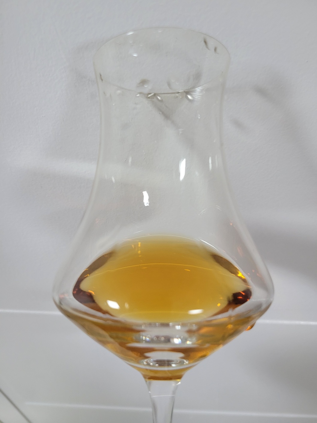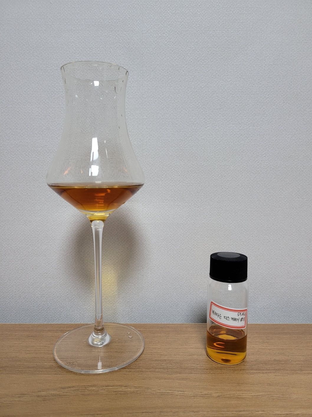 색: 주황빛이 도는 갈색을 띠며 레그는 잔 중간에 맺혀 매우 천천히 떨어진다.